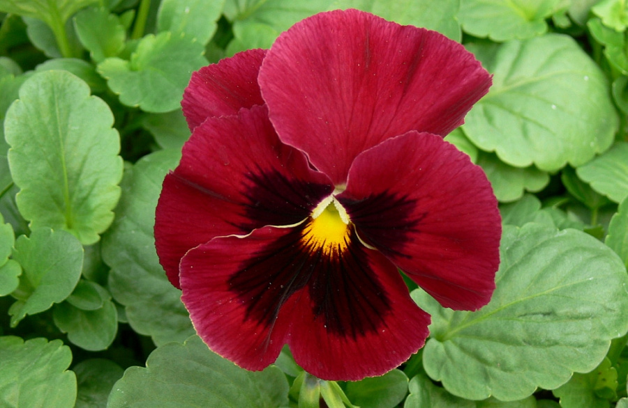 Семена анютиных глазок сорта Вечерний жар позволят садоводам вырастить крупные цветы с эффектной красной окраской. На нижних лепестках есть черные пятна, характерные для данной группы. Растение пользуется популярностью благодаря неприхотливости и обильному цветению.