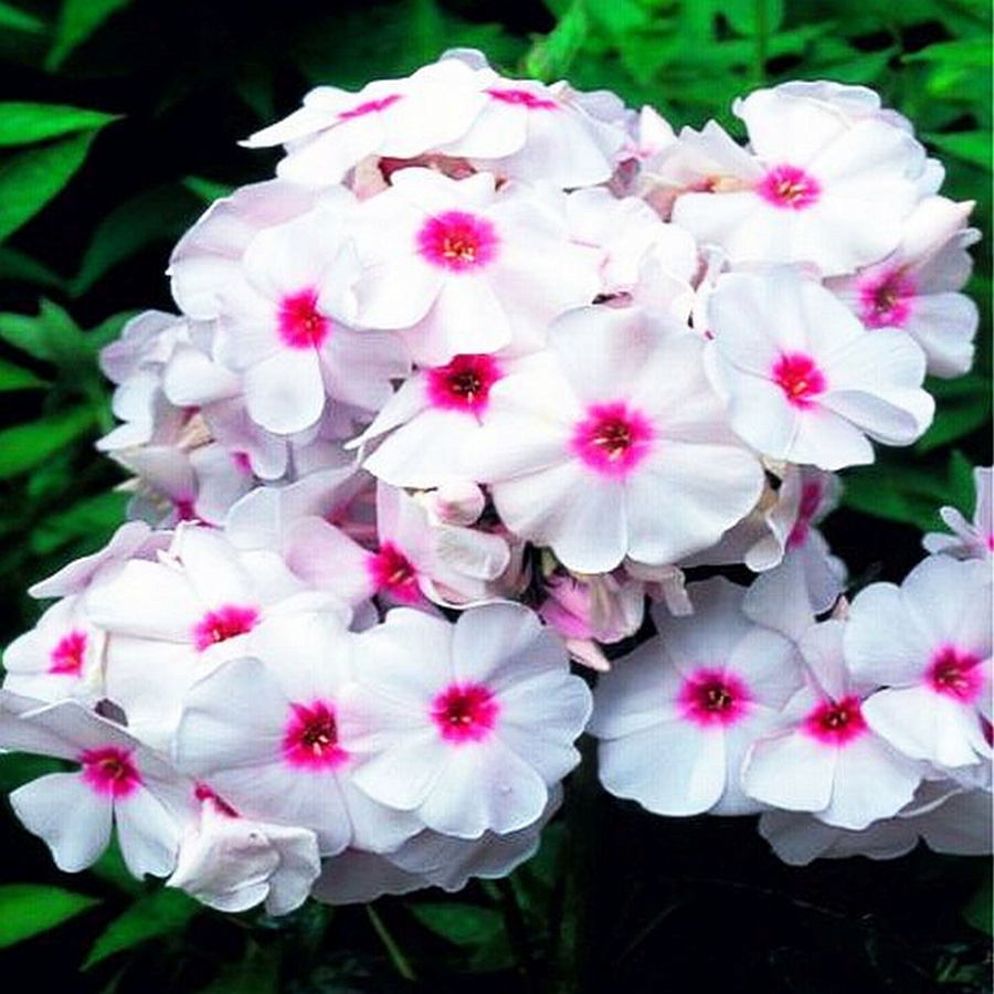- приятный сладковатый аромат. Цветки флокса метельчатого Граф Цеппелин очень нарядные, белого-розового цвета с яркой малиновой звездочкой по центру. Семена могут проращиваться для получения рассады. Этот сорт обладает отличной зимостойкостью, практически не привлекает внимание вредителей, редко болеет.