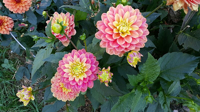 Пышные кустики Мелоди Аллерго не вырастают выше 60 сантиметров. На каждом растении формируется до десятка шаровидных соцветий диаметром 12 сантиметров. Середина цветка светлая, раскрытые лепестки окрашены в розовый, коралловый, лососевый оттенок. Цветение у георгины начинается уже в июле и продолжается до холодов.
