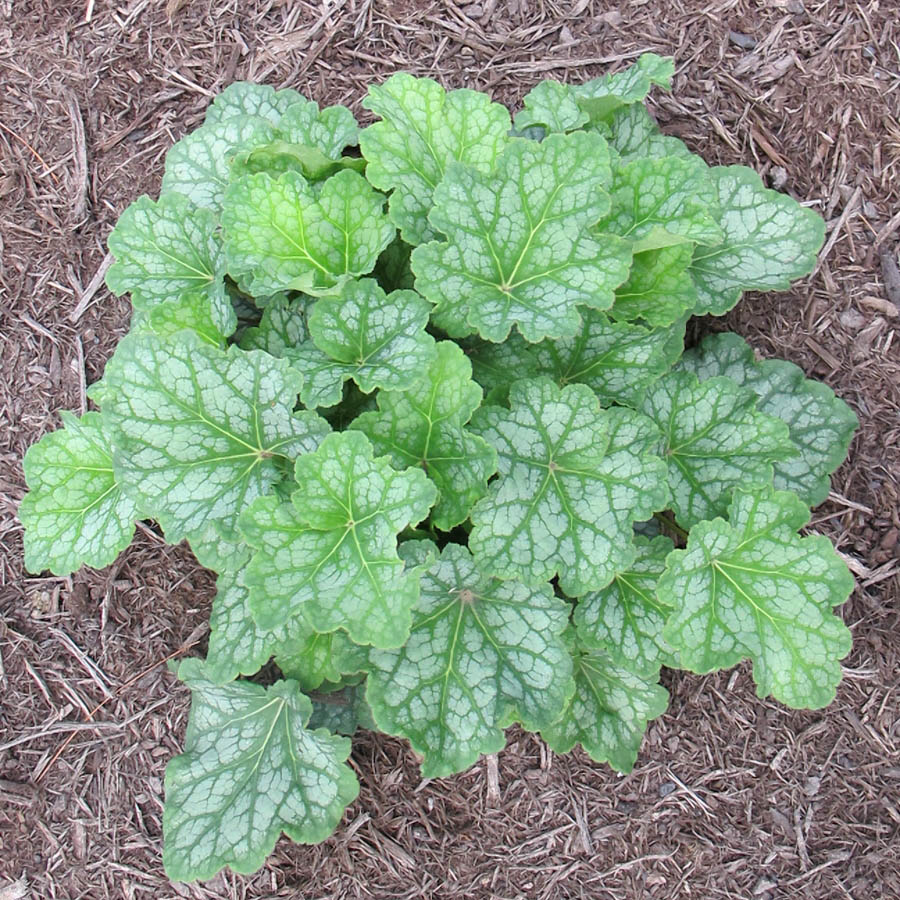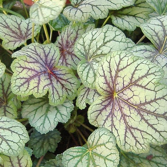 Рассада гейхеры Дэйл Стрейн (Dale Strain) поражает эффектным внешним видом. Поверхность листьев покрыта темными прожилками, контрастно выделяющимися на серебристо-зеленом фоне. В июле розетка выпускает стебель с зеленоватыми цветочками. Этот сорт применяют для украшения клумб, альпийских горок и водоемов.