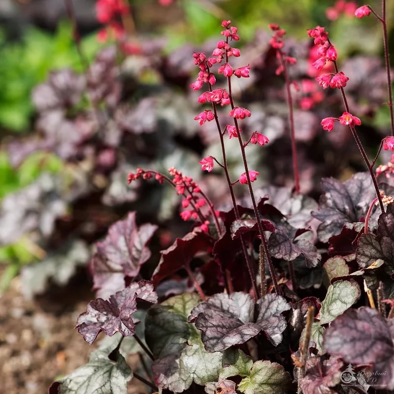 Рассада гейхеры Голливуд (Hollywood) благодаря своему эффектному виду станет центральной фигурой любой смешанной посадки. Многолетник с пурпурно-серебристой листвой и красными мелкими цветочками на длинных цветоносах станет украшением клумбы, миксбордера, искусственного водоема или альпийской горки.