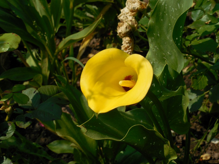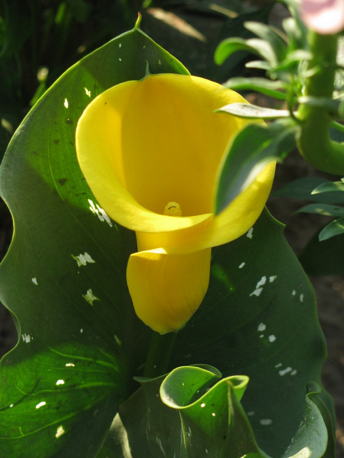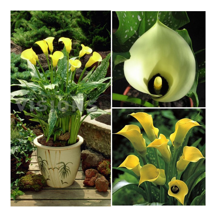 Луковицы Каллы гибридной Блек Меджик (Black Magic Calla) выпускают цветоносы с необычными цветками. По виду они такие же, как и большинство соцветий калл. Ярко-желтый початок укутан зеленовато-желтым покрывалом. Но нижняя внутренняя часть «бокала» окрашена в темно-коричневый цвет. Стреловидные листья крупные и блестящие. Они темно-зеленого цвета, покрыты серебристыми большими вкраплениями. Соцветие держится на кусте в течение 1,5 месяцев. В срезке оно простоит в первозданном виде 5–7 дней. Срезать соцветия необходимо до образования семян, тогда луковица успевает запастись питательными веществами перед зимовкой.
