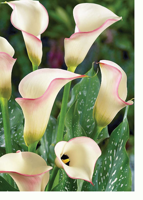 Луковицы Каллы гибридной Парфейт (Parfait Calla) с очаровательным цветком, которому под силу замедлить ход времени. Он имеет гармоничную расцветку — персиково-желтое покрывало обрамлено темно-розовой каймой. Листья темно-зеленого цвета. По ним разбросаны в хаотичном порядке белые точки и штрихи. Растение не имеет запаха. Оно не переносит сквозняков и пересыхание земляного грунта. При выращивании цветка в качестве комнатной культуры, следят, чтобы вода всегда оставалась в поддоне. В саду для него подыскивают место в низине или высаживают около кустарников и деревьев, которые защищают его от палящих лучей.