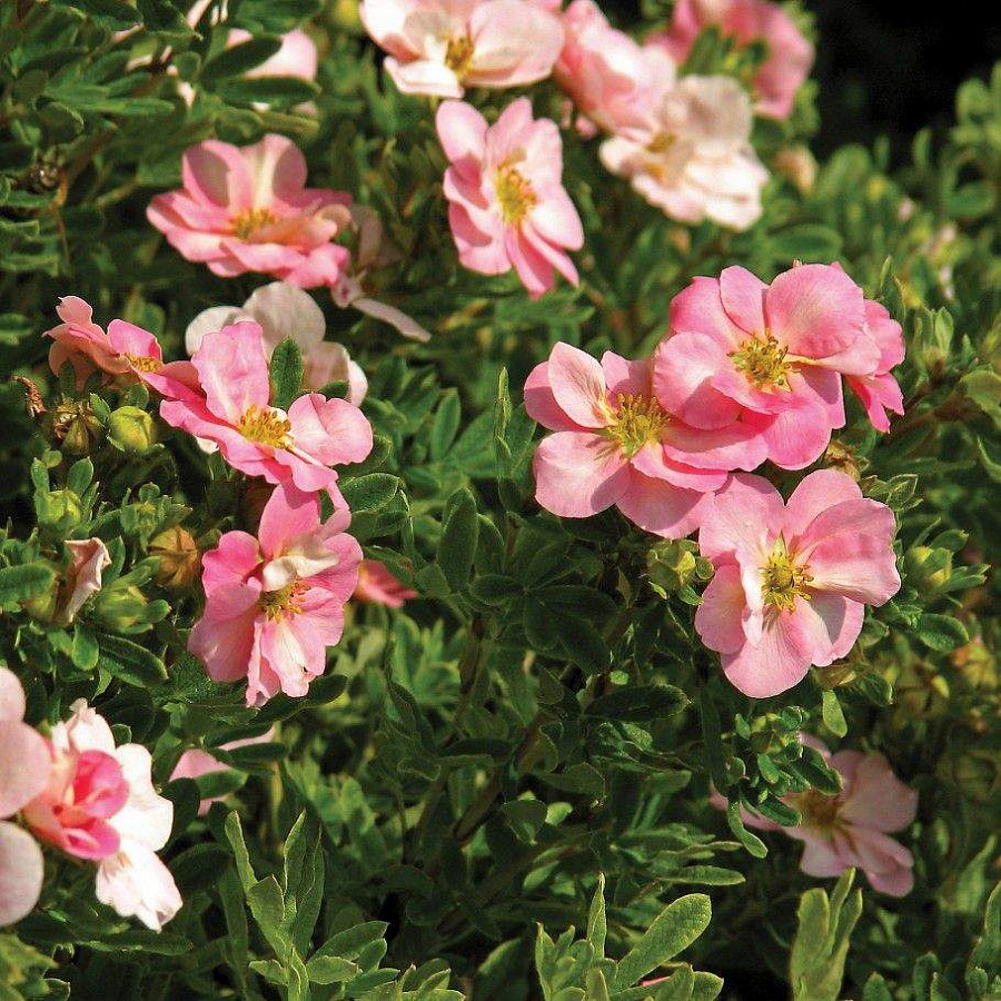 - у крупномера, посаженного в солнечном месте, крона густая и ажурная. Цветет этот сорт лапчатки с начала июня до середины октября. Ярко-зеленые листочки гармонично сочетаются с розовыми цветами. Сделать нежно-розовые цветы ярче и насыщенней поможет подкисление почвы и небольшая подкормка. Растению не страшны садовые вредители и сильные холода.