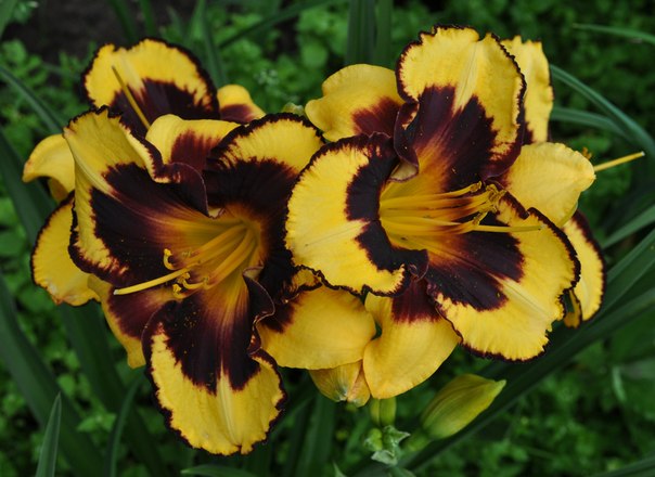 Окраска цветка : Лимонно-жёлтая с тёмно-бордовыми, почти чёрными пятном и тонким кантом