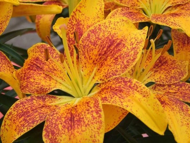 Окраска цветка : ярко-желтый с густым темно-красно-оранжевым крапом по всему лепестку, на кончиках крап реже и мельче