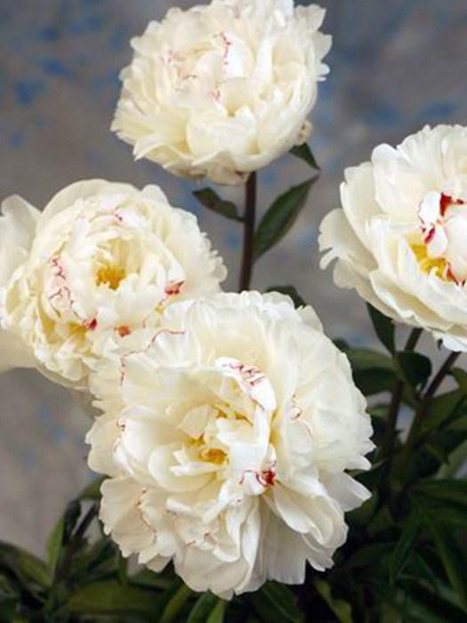 Саженцы пионов Буль Де Неж (Boule de Neige) высаживают на хорошо освещенные участки или в полутень. Взрослое растение сильнорослое с прямостоячими побегами. Высота многолетника варьируется от 80 до 100 см. Цветение среднераннее (май, июнь), обильное, продолжительное. Цветок чисто белый с малиновой окантовкой на некоторых центральных лепестках и ярко-желтыми тычинками, махровый. Внешний вид напоминает розу. Диаметр цветка 16 - 18 см. От него исходит приятный аромат. Сорт саженцев пионов Буль Де Неж характеризуется высокой устойчивостью к заболеваниям и морозам.