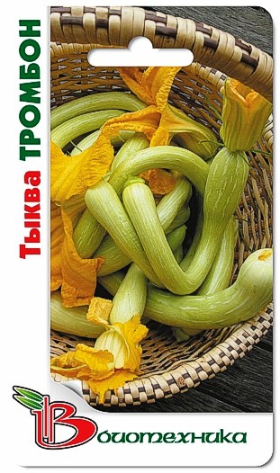 Семена тыквы "Тромбон" (Trombon) позволяют получать со своих грядок уникальный урожай плодов интересных своей формой. Сорт средне-спелый. Урожай готов к уборке на 110 день после появления массовых всходов. Тыква имеет длинную, цилиндрическую и сильно изогнутую форму. Кора окрашена в оранжевый цвет, плотная, но не толстая. Мякоть насыщенно-оранжевая, плотная, отличается сильным ароматом. Средняя масса плодов варьируется от 6 до 8 кг. Тыква используется для приготовления различных блюд: каш, пудингов, цукатов, тушенных и многих других.